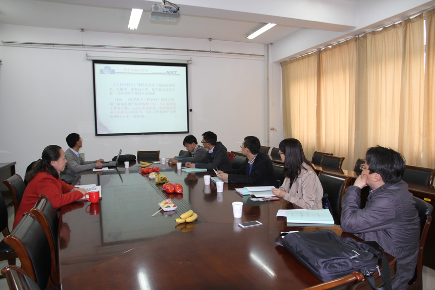 专家组成员首先听取了王少刚老师的汇报。王老师从教材的编写背景、教材编写的内容和目标、教材编写的特色和创新之处、教材编写目录四个方面对教材进行了详细阐述。副院长梁文萍对教材的特色之处进行了补充,指出《航空航天工程材料》是结合学校“三航”办学特色编写的一部适应航空航天类、材料类、机械类、能源动力类等专业人才培养需求工程材料类基础教材,同时兼顾民用,注重学科发展趋势,引入工程材料所属学科领域最新教学科研成果,及时跟踪国内外航空航天材料的发展趋势,将部分最新研究成果纳入到教材内容,充分体现教材的航空航天特色、以及先进性和应用性特点。