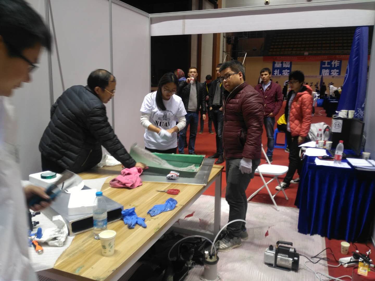 比赛过程中,为了精益求精地完成制件的制造,我校参赛队员为了编制准确全面而又通俗易懂的工艺手册、获得更加精确的模拟结果以及优化相关的PPT讲稿废寝忘食,精益求精,本次大赛队员们团结协作、努力奋进、充分展现了南航学子的风采。通过本次比赛进一步加强了我校复合材料团队与国内外同行的交流。