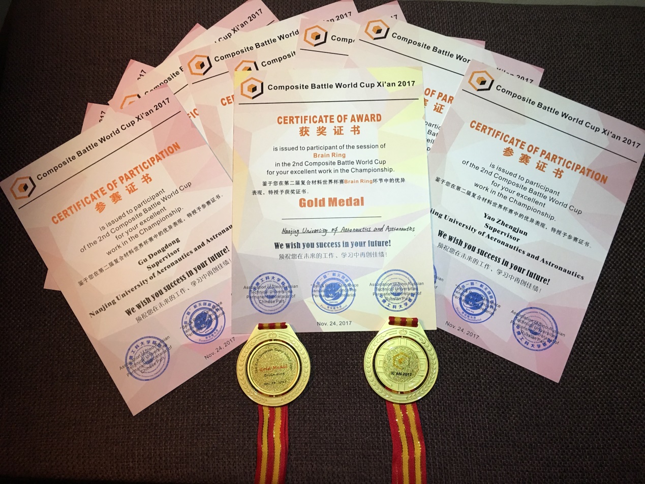 本次大赛围绕“翼盒”的设计、成型制造过程设置了“CAE模拟比赛Simulation and Structure analysis”、“复材知识大赛Brain Ring”、“设计制造过程Technological Contest”、“商业化前景Business case”、“学术报告Academic conference”五个环节,大赛是复合材料知识、设计、制造、性能模拟与测试全过程的比拼。我校虽首次参赛,但不畏强敌,创新思路,另辟蹊径,经过五天的激烈角逐,斩获“Brain Ring”环节金牌,充分体现了南航人跨越发展的智慧。西工大获得“CAE模拟比赛(Simulation and Structure analysis)”的第一名,其余环节的第一名均为国外队伍获得。