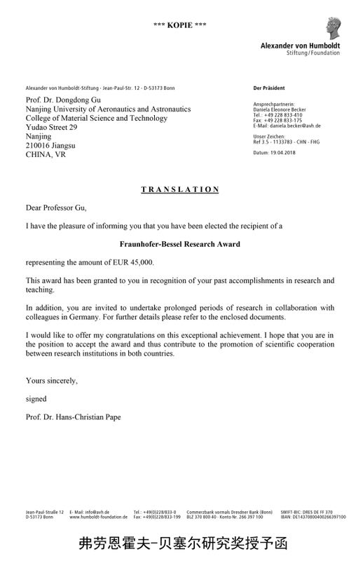 弗劳恩霍夫-贝塞尔研究奖需由隶属德国Fraunhofer学会的研究所所长提名,与被提名人不同国籍的数位国际专家推荐,最终由洪堡基金会经外审专家函评、学术委员会投票遴选等严格程序选出。我校顾冬冬教授长期从事高性能难加工金属构件激光增材制造3D打印研究工作,在金属构件激光增材制造的材料—结构—性能一体化研究领域取得了创新性研究成果,是国家“万人计划”科技创新领军人才,国家“万人计划”青年拔尖人才,教育部“长江学者奖励计划”青年学者,国家优秀青年科学基金获得者。顾冬冬教授由德国Fraunhofer激光技术研究所ILT所长、美国激光学会LIA主席Reinhart Poprawe教授提名申报,是Fraunhofer-Bessel Research Award设奖以来首位获此殊荣的中国大陆学者。