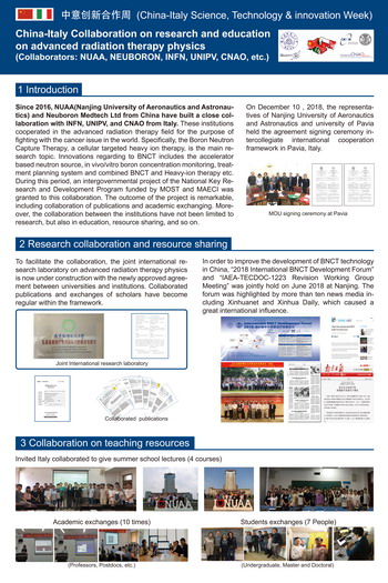 肉漫画 汤晓斌教授课题组从2015年起与意大利国家核物理研究院、意大利帕维亚大学开展科学研究、人才培养方面的国际合作。2016年,联合意大利合作单位申报获批了国家重点研发计划政府间国际科技创新合作重点专项——加速器硼中子俘获癌症治疗超热中子束设计与剂量优化。该项目多次得到中意两国外交、科技部门的关注,寄希望该项目成果能成为“一带一路”计划中意合作的实质性标志成果。由肉漫画 牵头,2018年12月我校与意大利帕维亚大学签署了校际合作框架协议;2019年10月又签署了两校共同成立“先进放射治疗物理国际合作联合实验室”协议。截止到今年下半年,中意双方互派本科生、硕士生和博士生交流联培共20余人次;科研人员联合发表学术论文33篇;共同举办了2018国际硼中子俘获治疗发展论坛;意大利帕维亚大学知名教授来校开设国际暑期课程4门。通过与意大利各科研机构的国际学术交流与合作,有利推动了我校核科学与技术学科的发展,实现了人才培养和科学研究的双赢,期待这些合作成果能成为我校国际化建设的标志性成果。