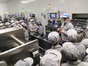 师生的到来表示热烈欢迎,袁庆梦总经理介绍了公司的基本布局和主要业务,强调锂电池的生产与研发与新能源材料与器件专业联系十分紧密。随后,在袁经理的带领下,全体师生经过严格标准的除尘流程,进入了生产车间,参观了锂电池生产的核心步骤,包括混料,涂布,冷压,卷绕等。企业相关负责人就生产流程向同学们进行了详细的介绍讲解,帮助学生们将课本知识与生产实际结合起来,拓宽了学生的视野。