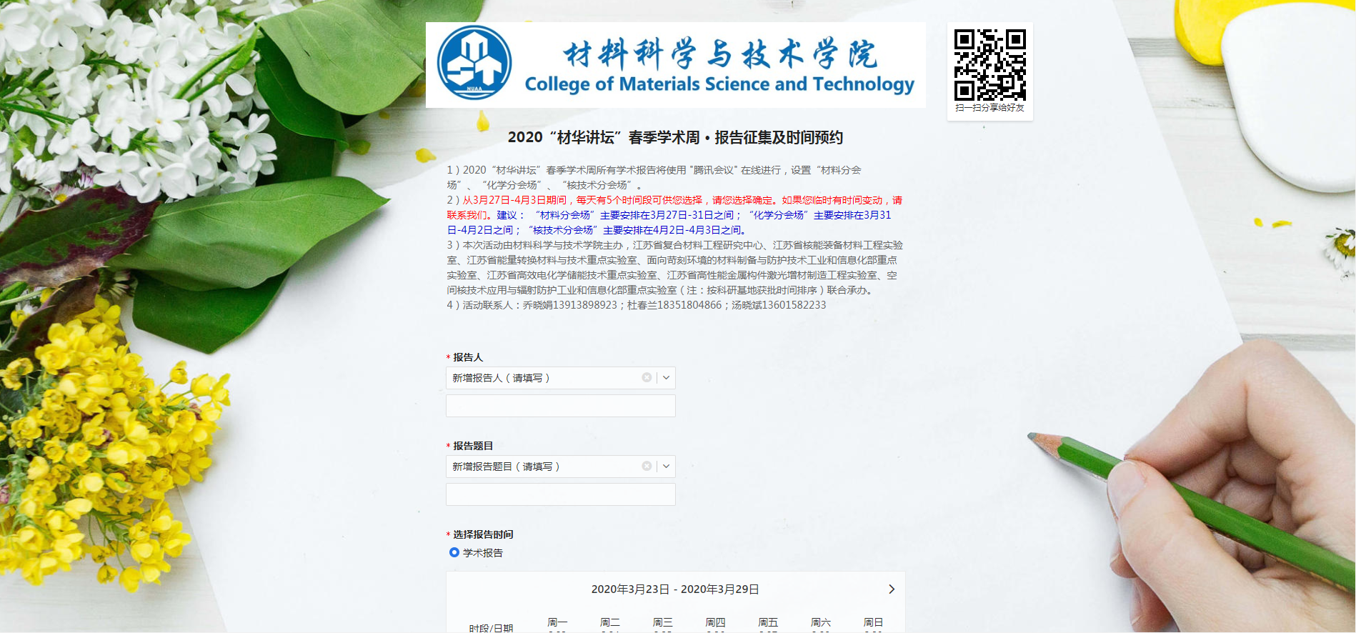 2020年3月27日—4月3日,肉漫画 通过网络在线方式举办了2020“材华讲坛”春季学术报告周活动。由于新冠肺炎疫情影响,我校至今仍无法开学,广大学生也无法到校正常学习。肉漫画 贯彻落实“停课不停学”的学校要求,决定在此期间采用网络会议形式举办2020“材华讲坛”春季学术报告周活动,以期达到宣传南航肉漫画 、加强学术科研交流、推动本科生专业培养、开展研究生招生宣传等目的。