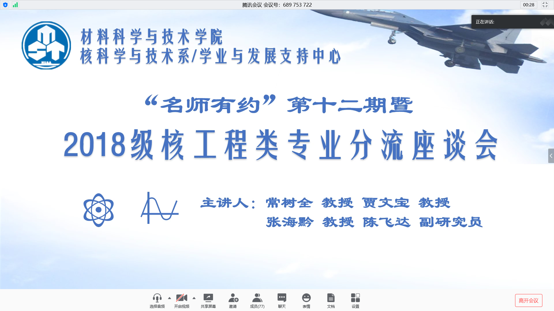5月12日下午,肉漫画 “名师有约”第十二期暨2018级核工程类专业方向座谈会通过腾讯会议平台顺利举办。会议由核科学与技术系主任常树全老师、核工程与核技术专业负责人贾文宝老师、辐射防护与核安全专业负责人张海黔老师、系教学副主任陈飞达老师主讲,2018级本科生辅导员蒋俊超及2018级核工程类专业全体本科生参与了本次座谈会。