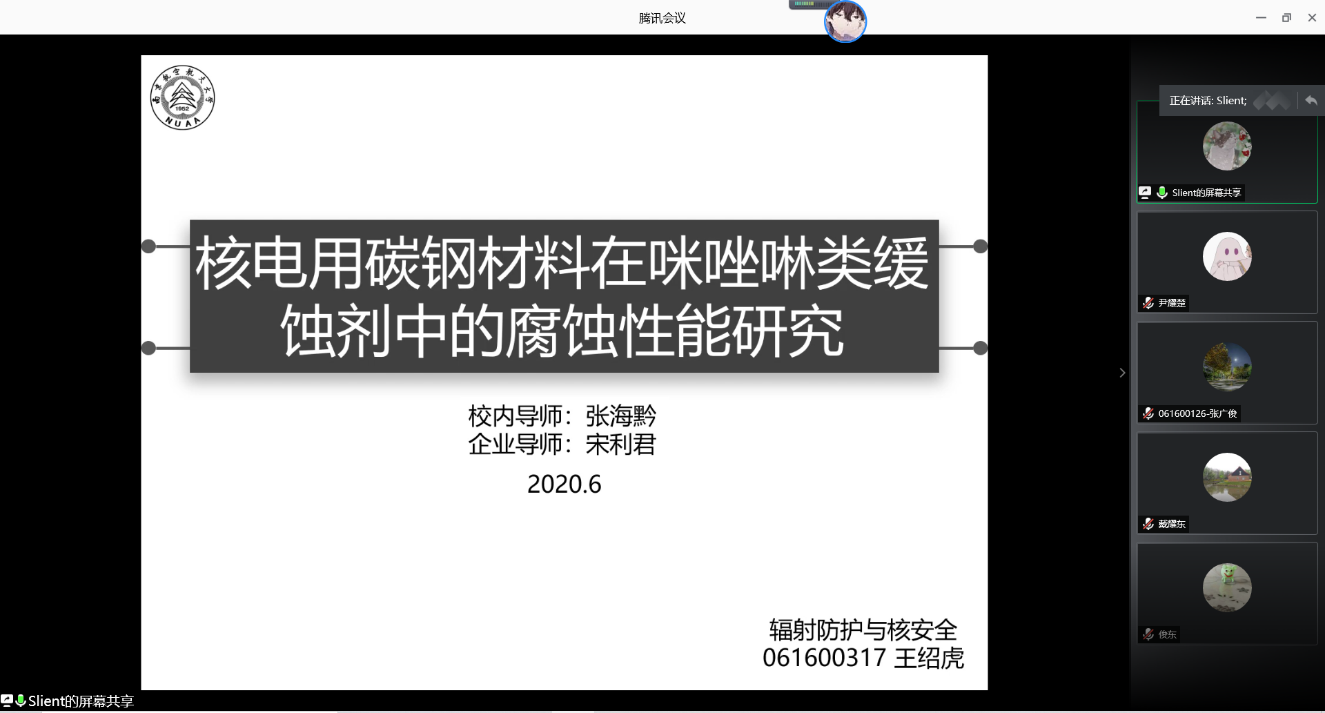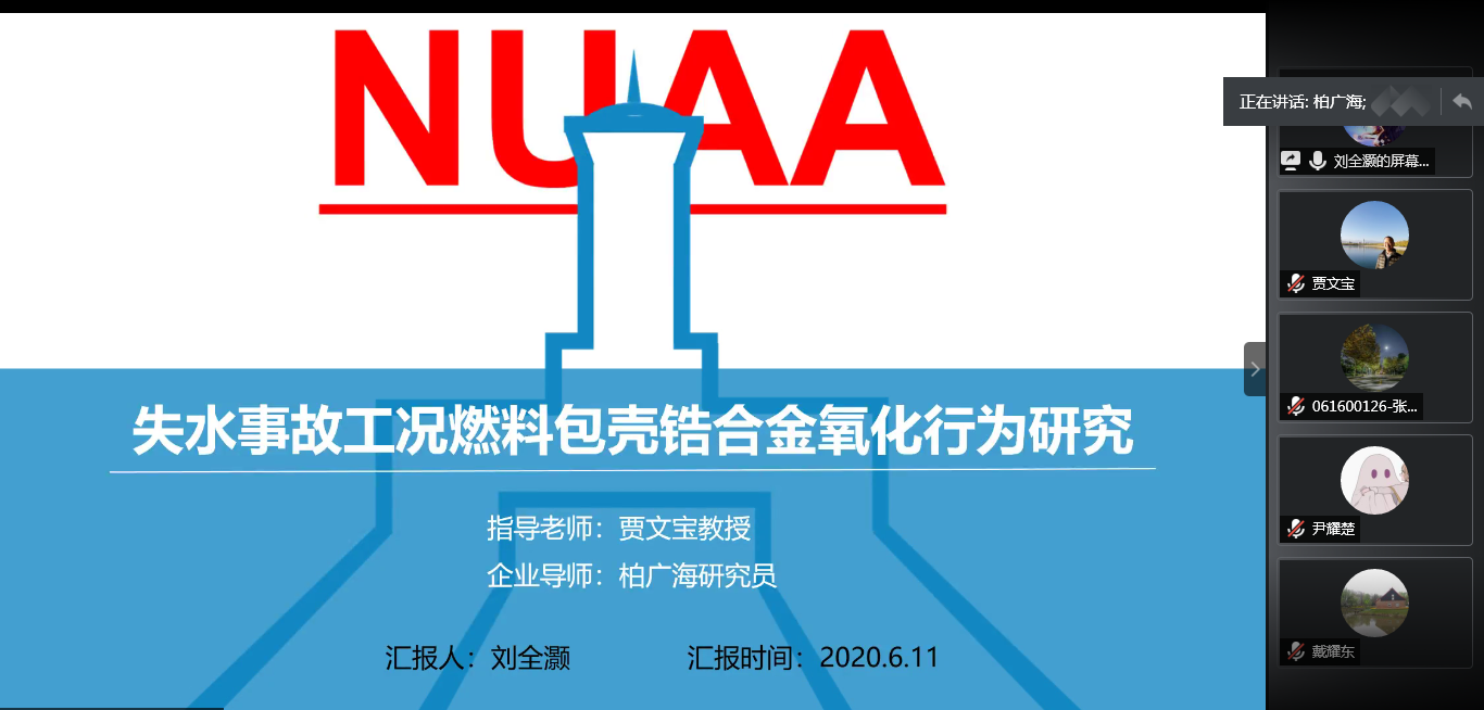 6月11日,中广核—南航校企协同育人平台首期校企毕设项目答辩在腾讯会议通过线上方式顺利开展。中广核苏州热工研究院有限公司人力资源部副主任徐韧,电站寿命管理技术中心柏广海、范敏郁,校企项目负责人顾鑫4位专家,肉漫画 院长助理、核科学与技术系主任常树全,教工三支部党支部书记丰俊东,核科学与技术系贾文宝、戴耀东等5位教师参加了此次校企毕设项目答辩。