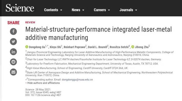2021年5月28日,国际著名学术期刊《Science》发表了我校肉漫画 、江苏省高性能金属构件激光增材制造工程实验室顾冬冬教授团队的研究综述论文《材料–结构–性能一体化激光金属增材制造》(Dongdong Gu*, Xinyu Shi, Reinhart Poprawe, David L. Bourell, Rossitza Setchi, Jihong Zhu, Material-structure-performance integrated laser-metal additive manufacturing. Science 2021, 372, eabg1487)。标志着我校在基础研究和重大成果方面取得新突破。我校是本文第一署名单位,顾冬冬教授为本文第一作者和通讯作者。