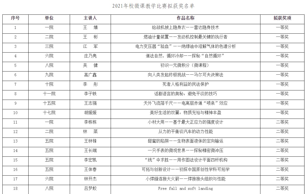 此前,在校选拔赛中,庄乃亮老师的《道法自然,循环冷却——探秘“自然循环”》、林开杰老师的《小焊缝连接大火箭——焊接接头组织与性能》分别获得校级一等奖、二等奖。