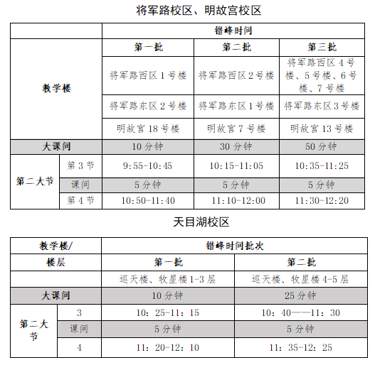 本学期3-4节课继续实行错峰上下课,各校区具体上课时间见下表: