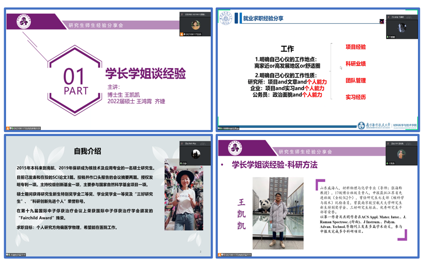 在“学长学姐谈经验”环节,2022届硕士毕业生齐婕、王鸿霄、2017级博士生王凯凯面向研一学生分别就读研感悟、科研方法、求职经验等主题与同学们做交流。齐婕建议大家要“多阅读、多积累”“多请教、多沟通”“有规划、有目标”,尤其强调要学会自我调节,培养乐观健康的心态。王凯凯就毕业论文撰写前后的流程及注意事项为大家做分享,他指出,要做好文献阅读的基本功,在此基础上再“科学地提出问题、合理地选择方法、有效地利用数据、深入地讨论成果”。王鸿霄介绍了自己签约中国工程物理研究院材料研究所的经历与方法,他表示,“研一准备求职不是‘太早’,而是‘刚刚好’”,强调研一学生要注意在学习、科研、学生工作等方面的积累。师兄师姐们无私分享学术路上的点点滴滴,为师弟师妹们指点迷津。