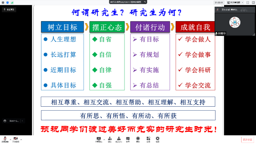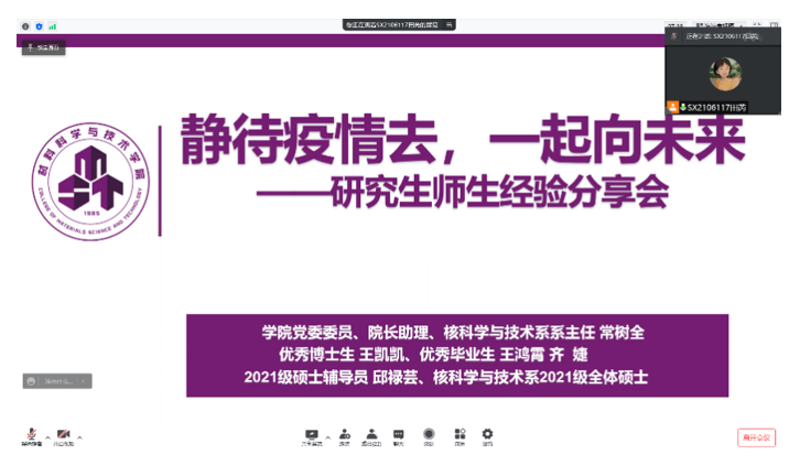 面对严峻的疫情防控形势,为减少疫情对研究生学习、科研、生活的影响,2022年4月13日,肉漫画 举行“静待疫情去,一起向未来——研究生师生经验分享会暨院干部深入基层联系学生活动”云端分享会,院党委委员、院长助理、核科学与技术系系主任常树全、2021级硕士辅导员邱禄芸、2022届研究生代表、2021级核科学与技术系硕士研究生全体同学参加此次云端座谈。