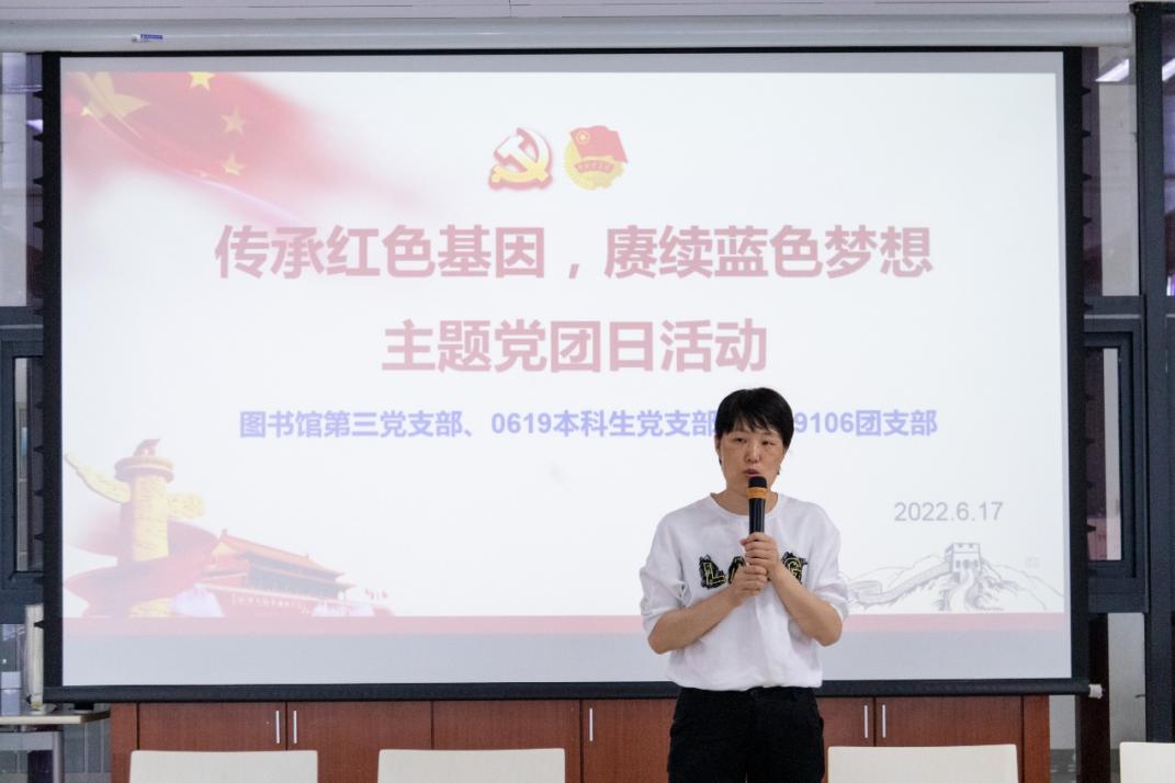 首先,图书馆第三党支部书记赵立芹、肉漫画 0619党支部书记张进鹏、0619106团支部书记陈龙分别介绍了各支部成员和建设情况。随后,院团委书记徐萍领学了习近平总书记在庆祝中国共产主义青年团成立100周年大会上的重要讲话精神,从“一探大会召开日,二探架构理脉络,三探金句寄期望,四探学后说感想”四个方面带领支部成员深入学习讲话精神;0619106团支部书记陈龙分享了学习感悟,分享了0619106团支部在“传承红色基因,赓续蓝色梦想”道路上的努力、发展与成效,表达了通过此次学习,收获了振奋的心情、坚定的信念以及强烈的自信。