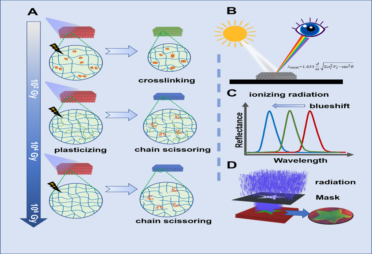 与自然界中蝴蝶、变色龙、鸟类羽毛类似,光子晶体并不依靠色素来显示颜色,而是通过与光波长相仿的周期性微结构的布拉格衍射来形成虹彩色。王运龙博士将聚合物的辐射效应与光子晶体相结合,首次提出一种全新的剂量检测方案,即利用光子晶体薄膜在X或γ射线的连续照射下实现布拉格反射峰的全可见光谱移动来实现剂量检测。该光子晶体剂量计的剂量应用范围具有高度可调性和良好的空间分辨率(优于30 μm)。与传统的辐射变色剂量计相比,这种剂量计还对光、温度和湿度表现出良好的环境稳定性。更重要的是,这种光子晶体剂量计除了传统的光谱仪检测方法,还可以通过肉眼对比标准色卡,甚至利用手机拍照得到的色调值进行快捷智能的剂量识别,这为其在工业辐照、大科学装置和放射医疗中的应用提供了极大便利。