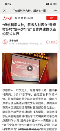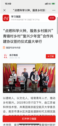 3月17日下午,南京航空航天大学师生赴溧水区洪蓝街道青锋村参加乡村“复兴少年宫”合作共建协议签约仪式暨江苏省科学技术馆“乡村科普教育基地”和南京航空航天大学“乡村振兴实践基地”揭牌仪式。江苏省科学技术馆副馆长王维,溧水区洪蓝街道傅家边管委会副主任端木传龙,党工委委员、宣传委员、统战委员胡靖,肉漫画 党委副书记庄晓舒参加了此次活动。活动得到了学习强国、人民日报、扬子晚报、南京零距离等8家媒体的宣传报道。