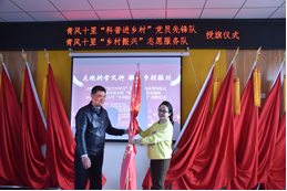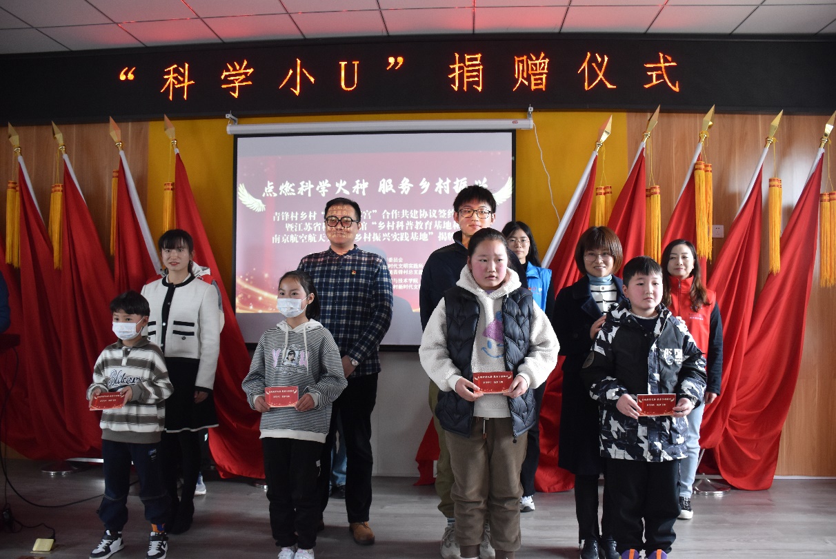同时,江苏省科技馆与南京航空航天大学向青锋村小朋友捐赠了“科学小U”科普视频;青锋村党总支书记徐大春为江苏省科技馆科普工作者代表刘艳授“科普进乡村”党员先锋队旗,为南京航空航天大学志愿服务队代表李剑超授“乡村振兴”志愿服务队旗。