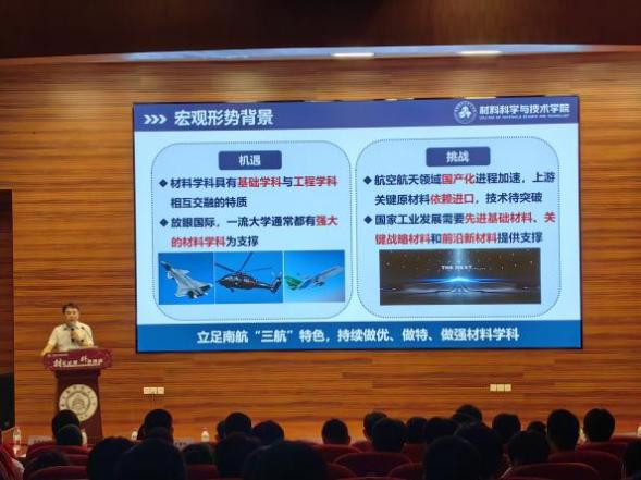 随后,院长顾冬冬以“来到南航肉漫画 ,让梦想发生”为题介绍肉漫画概况 ,围绕教育资源、培养目标、办学成效作详细介绍。他指出,学院的科研平台、人才培养模式、科研水平、育人文化、国际合作,能够充分承载同学们的梦想,勉励新生敢为人先、勇于创新,脚踏实地、勤学善思,为航空航天民航事业贡献材料强国力量。