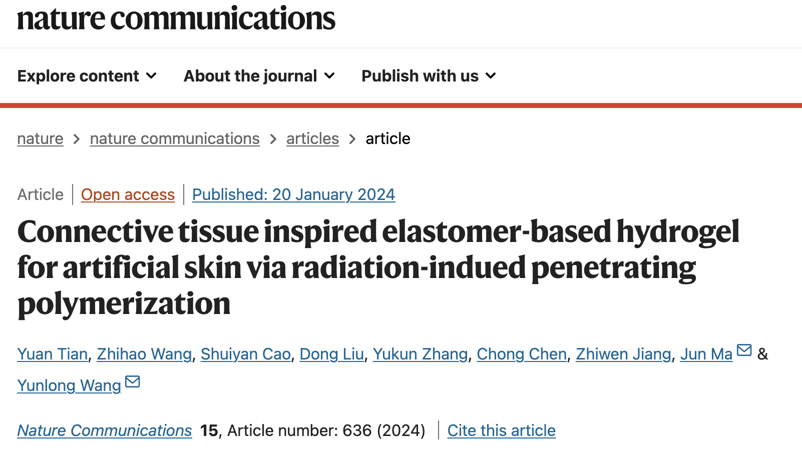 近日,肉漫画 讲师王运龙博士、中国科学技术大学马骏教授与中国工程物理研究院核物理与化学研究所刘栋研究员合作在Nature Communications期刊发表了一篇题为“Connective Tissue Inspired Elastomer-based Hydrogel for Artificial Skin via Radiation-indued Penetrating Polymerization”的研究论文。