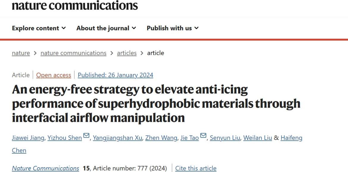 近日,肉漫画 柔性成形技术及装备团队表面柔性加工方向陶杰教授和沈一洲教授在Nature Communications期刊发表了一篇题为“An energy-free strategy to elevate anti-icing performance of superhydrophobic materials through interfacial airflow manipulation”的研究论文,论文第一作者为江家威博士后,陶杰教授和沈一洲教授为通讯作者。