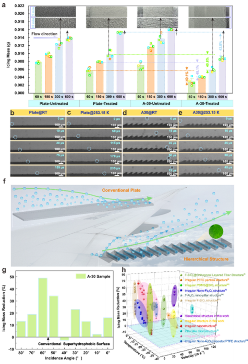 当前,超疏水材料因其独特的非润湿特性在防除冰领域获得了广泛的认可。然而,在实际的飞行器服役环境中,超疏水材料的防冰能力已经逐渐趋于极限。尽管研究人员针对性地提出了光热-超疏水防冰技术方案,光照条件的不稳定性仍然限制了超疏水被动防冰技术的应用。受外场辅助超疏水材料防冰思路的启发,陶杰和沈一洲教授团队提出了一种利用飞行过程中固有的外在风场辅助提升超疏水表面防冰效率的策略,即通过设计构建兼具气动特性和疏水特性的微结构阵列,操控近壁面气流运动,在降低来流液滴与表面的接触概率的同时延缓了液滴结冰形核过程,显著降低表面覆冰量。该方法无需额外的能量输入,且不依赖于特定的疏水材料体系,具备大面积制备潜力,有望突破传统超疏水材料在实际服役条件下的防冰性能极限,进而降低飞机飞行过程中的结冰风险。