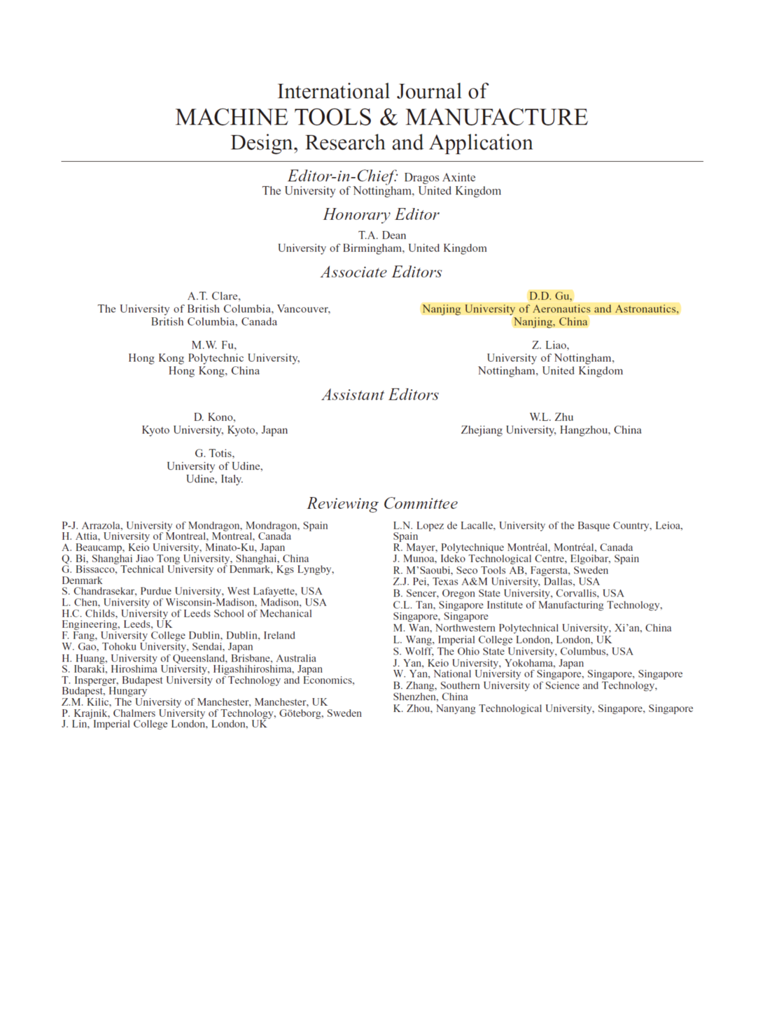 近日,应国际生产工程科学院CIRP会士、国际知名期刊International Journal of Machine Tools and Manufacture主编、英国诺丁汉大学Dragos Axinte教授邀请,自2024年起肉漫画 顾冬冬教授担任International Journal of Machine Tools and Manufacture副主编(Associate Editor),主要负责增材制造领域论文评审及发表工作。