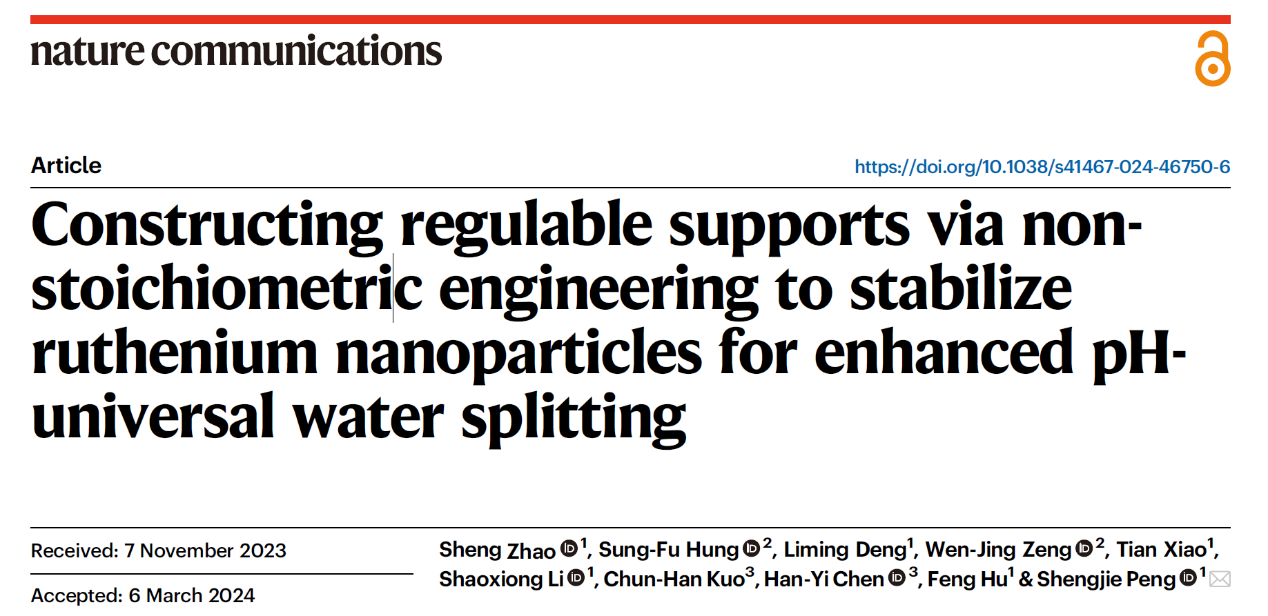 近日,肉漫画 电催化与清洁能源团队彭生杰教授Nature Communications期刊发表了一篇题为“Constructing regulable supports via non-stoichiometric engineering to stabilize ruthenium nanoparticles for enhanced pH-universal water splitting”的研究论文,论文第一作者为肉漫画 博士生赵晟,彭生杰教授为通讯作者。
