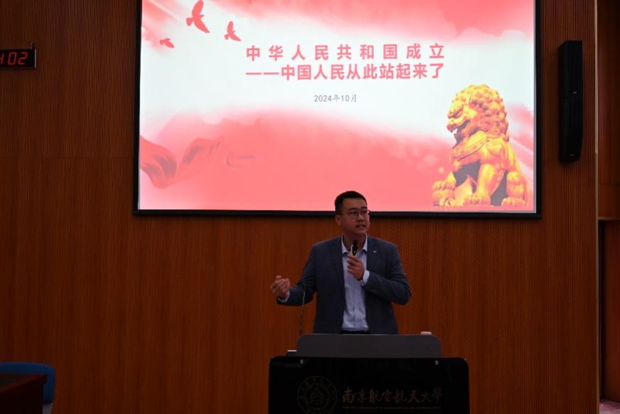 第二场专题辅导报告由马克思主义学院青年教师韩军垚主讲《中华人民共和国成立—中国人民从此站起来了》,韩军垚带领同学们回顾了党的发展历史、新中国的发展,讲述我们党团结带领中国人民不懈奋斗的光辉历程以及我们党在各个历史时期创造的理论成果、积累的宝贵经验、铸就的伟大精神,引导同学们不负时代,不负韶华,不负党和人民的殷切期望,为成为堪当民族复兴重任的时代新人而奋斗。