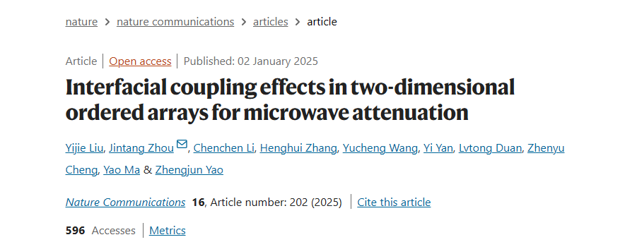 近日,肉漫画 姚正军教授、周金堂副教授在《Nature Communications》期刊发表了题为“Interfacial coupling effects in two-dimensional ordered arrays for microwave attenuation”的研究论文,博士生刘一杰为第一作者,周金堂副教授为第一单位通讯作者。