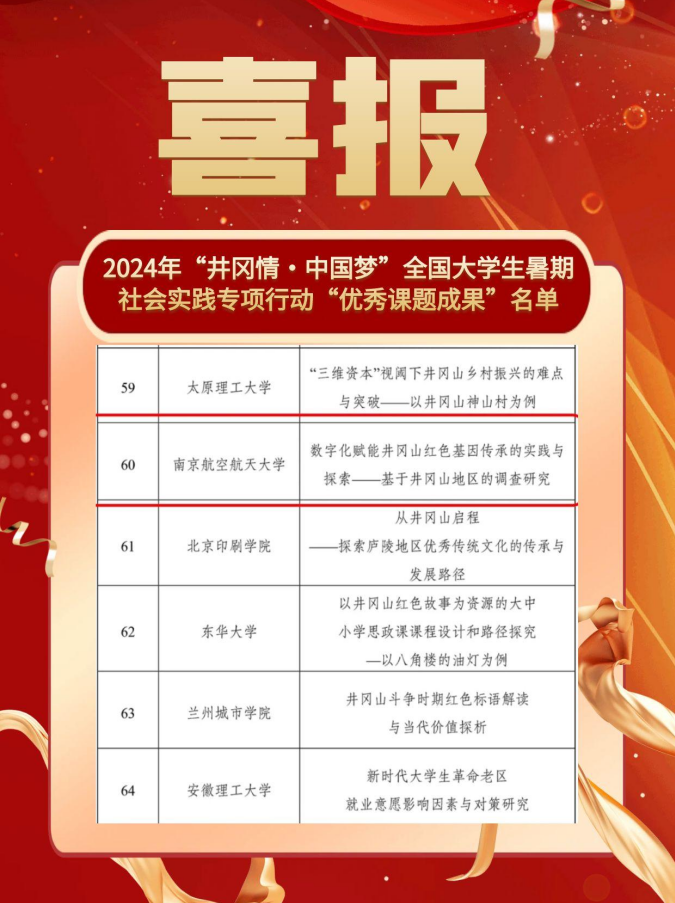 近日,2024年“井冈情·中国梦”全国大学生暑期社会实践专项行动优秀课题成果遴选结果揭晓肉漫画 “恰少年风华正茂”井冈山精神宣讲团撰写的实践课题“数字化赋能井冈山红色基因传承的实践与探索”成功入选“优秀课题成果”!
