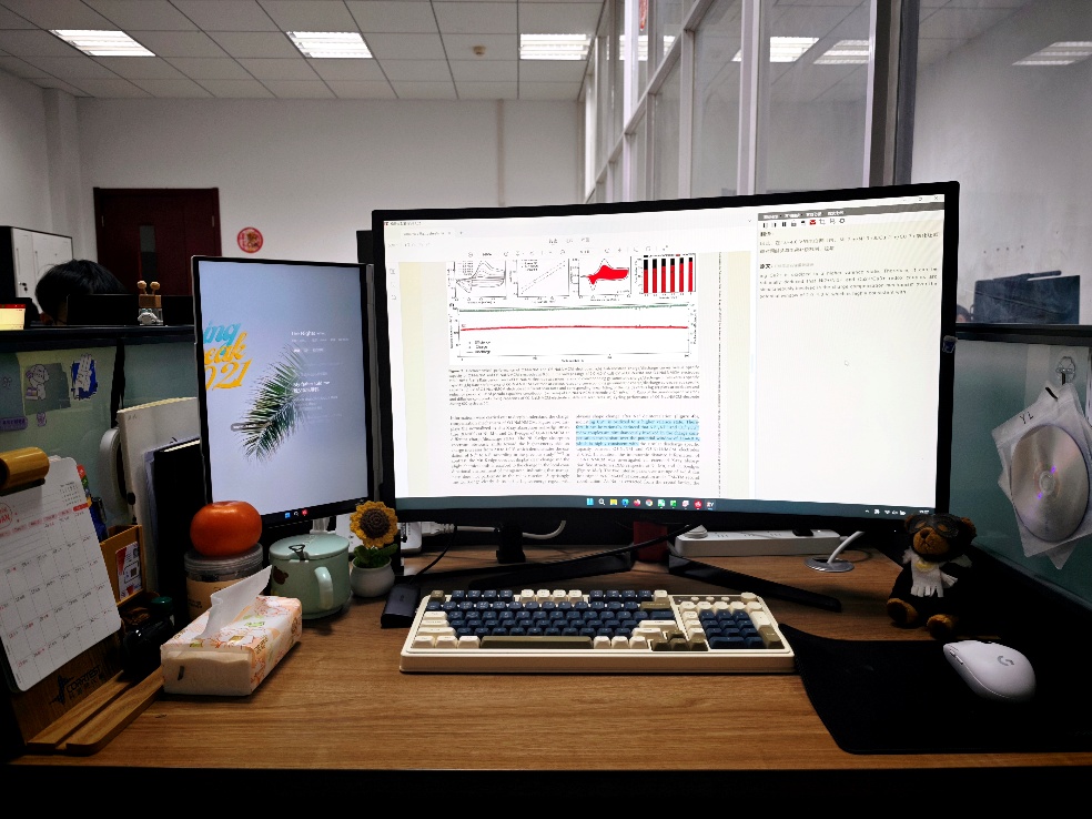 以“学术效率+温馨细节”为核心,双屏满足论文阅读与数据处理的同步操作,机械键盘适配高频码字需求;桌面摆上小绿植、玩偶和水果,在材料研究的高压节奏里,添上几分治愈的生活气息。